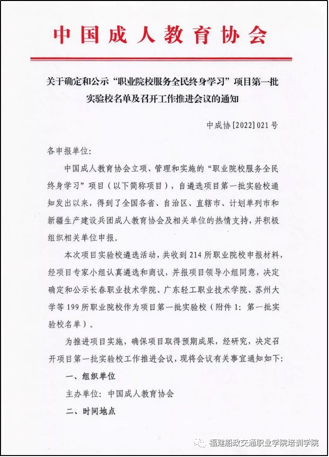 6月10日,中國成人教育協(xié)會發(fā)布《關(guān)于確定和公示“職業(yè)院校服務(wù)全民終身學(xué)習(xí)”項目第一批實驗校名單及召開工作推進(jìn)會議的通知》(中成協(xié)〔2022〕21號),我院榜上有名,成功入選全國“職業(yè)院校服務(wù)全民終身學(xué)習(xí)”項目首批實驗校。