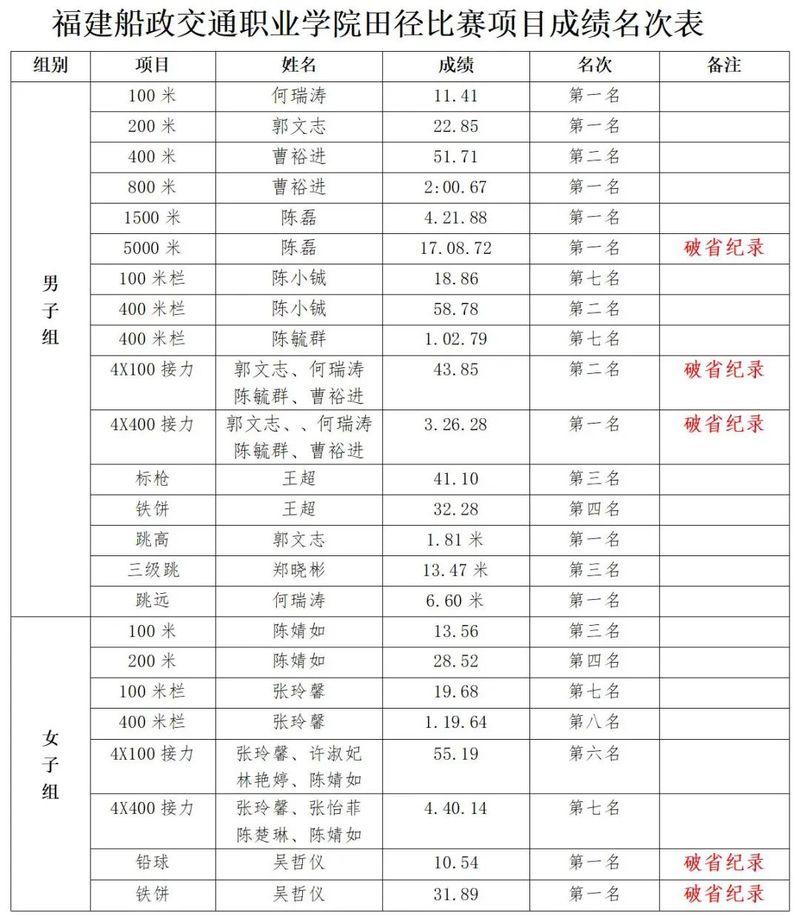 福建省第十七屆運(yùn)動(dòng)會(huì)大學(xué)生部圓滿落幕,福建船政交通職業(yè)學(xué)院代表團(tuán)以712分,30金、15銀、12銅的優(yōu)異成績(jī)獲得團(tuán)體總分第一、金牌數(shù)第一、獎(jiǎng)牌數(shù)第一,并打破5項(xiàng)田徑福建省丙組最高紀(jì)錄!