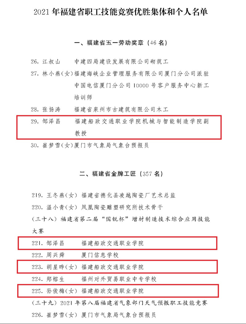 近日,福建省總工會下發(fā)《關于表彰2021年全省勞動和技能競賽優(yōu)勝集體和個人的決定》(閩工〔2022〕104號),機械與智能制造學院鄒澤昌、胡星曄、孫俊梅榜上有名。鄒澤昌榮獲“福建省五一勞動獎章”榮譽稱號,鄒澤昌、胡星曄、孫俊梅榮獲“福建省金牌工匠”榮譽稱號。