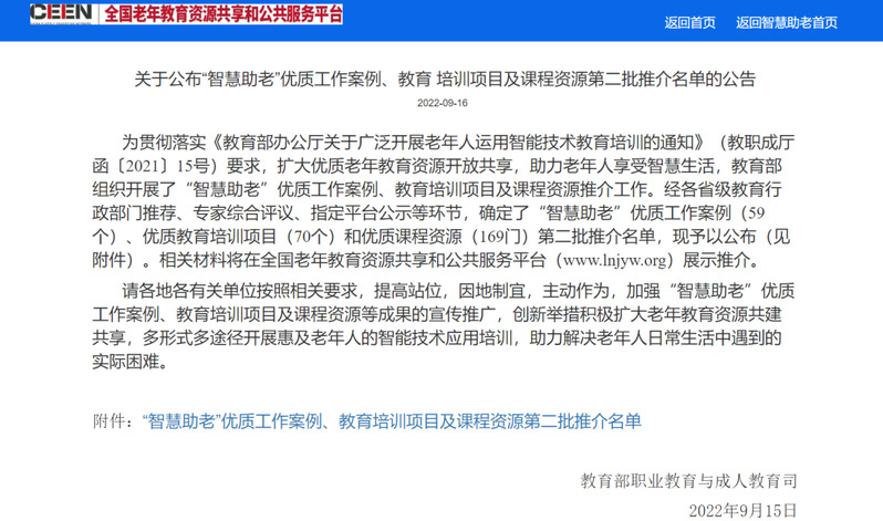 9月15日,教育部職業(yè)教育與成人教育司公布了第二批“智慧助老”優(yōu)質(zhì)工作案例(59個(gè))、優(yōu)質(zhì)教育培訓(xùn)項(xiàng)目(70個(gè))和優(yōu)質(zhì)課程資源(169門),我院《開設(shè)智能手機(jī)應(yīng)用課堂 助力老人融入智慧生活》項(xiàng)目入選為“智慧助老”優(yōu)質(zhì)工作案例,將在全國(guó)老年教育資源共享和公共服務(wù)平臺(tái)展示推介。