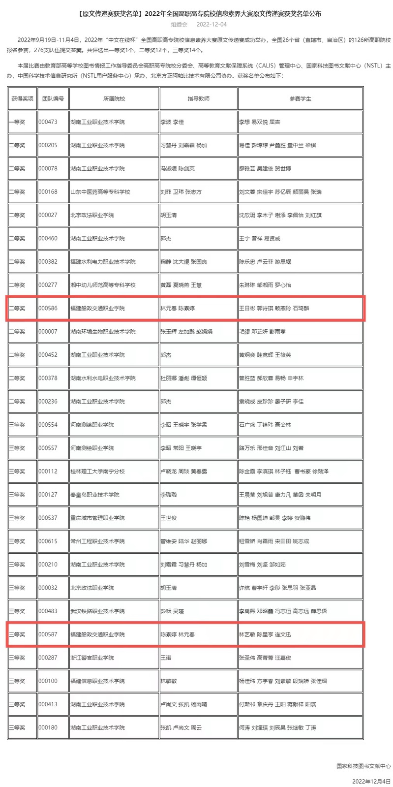 2022年“中文在線杯”全國(guó)高職高專院校信息素養(yǎng)大賽原文傳遞賽于9月19日-11月4日成功舉行,來(lái)自全國(guó)26個(gè)?。ㄖ陛犑?、自治區(qū))126所高職院校的276支隊(duì)伍參加比賽,我校圖書(shū)館組織2支學(xué)生團(tuán)隊(duì)參加。