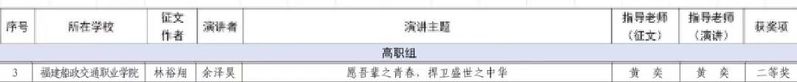 日前,中共福建省委教育工委印發(fā)《關(guān)于公布第六屆“馬克思主義能夠給予我們什么”福建省高校大學(xué)生主題征文和微演講活動獲獎名單的通知》。經(jīng)高校推薦、專家評審、網(wǎng)上公示等環(huán)節(jié),省委教育工委評選出第六屆“馬克思主義能夠給予我們什么”福建省高校大學(xué)生主題征文和微演講活動獲獎名單,我校作品《愿吾輩之青春,捍衛(wèi)盛世之中華》(征文作者:林裕翔,演講者:余澤昊,指導(dǎo)教師:黃奕)獲二等獎。