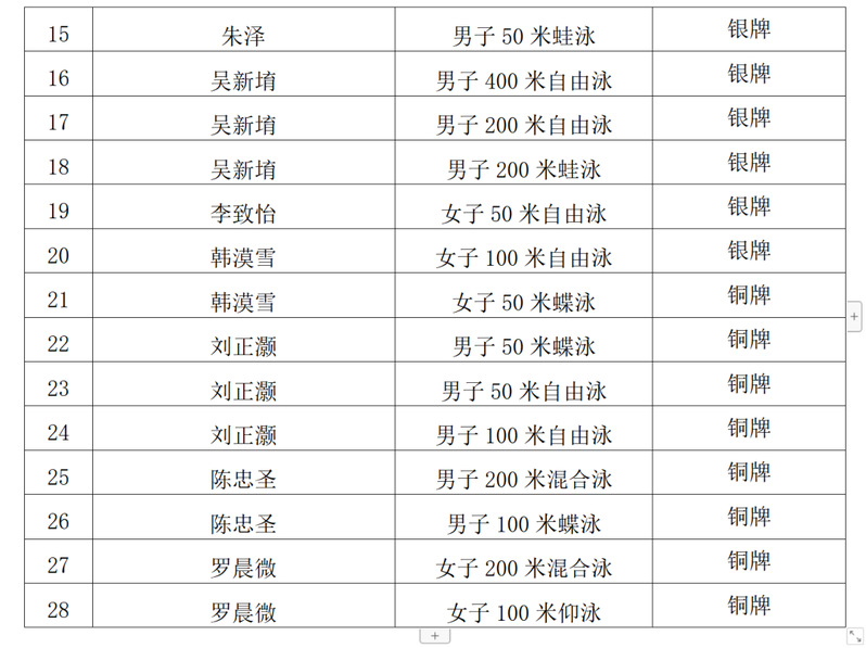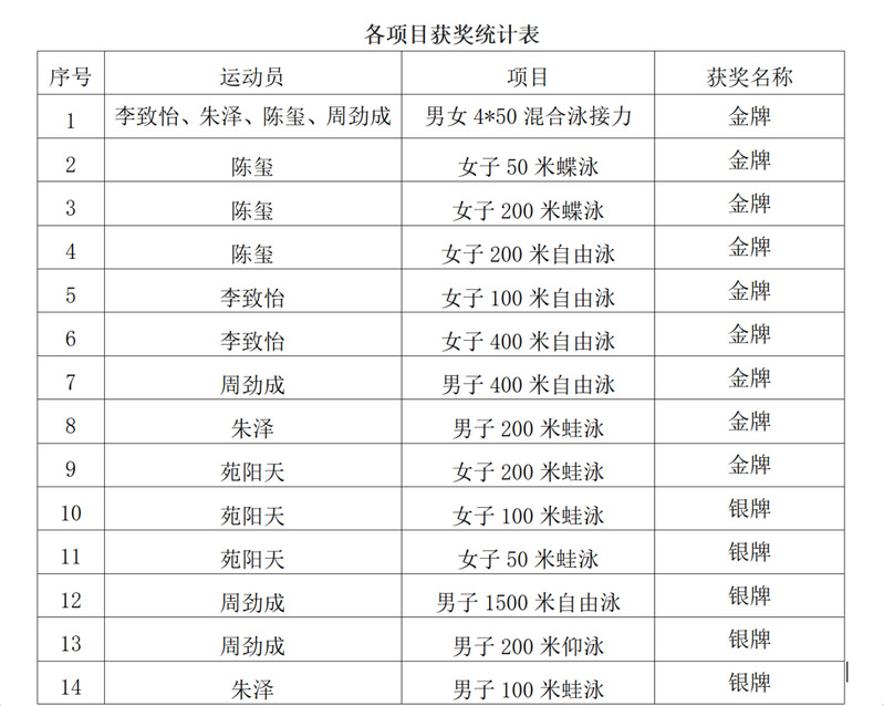 6月22日-25日,2023年福建省大學生游泳錦標賽在福建省龍巖市連城縣成功舉辦。本次賽事分為甲、乙、丙、丁四個組別,我校共派出10名游泳隊員參加丙組比賽(高職高專院校),斬獲9金11銀8銅,取得團體總分第一名的佳績。