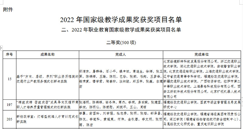 近日,教育部公布了2022年國(guó)家級(jí)教學(xué)成果獎(jiǎng)獲獎(jiǎng)項(xiàng)目名單。由我校主持申報(bào)的《“精益求精密益求密”成果導(dǎo)向雙循環(huán)高職人才培養(yǎng)質(zhì)量管理模式的創(chuàng)新實(shí)踐》《新船政學(xué)堂:燈塔型航海人才育訓(xùn)范式創(chuàng)新實(shí)踐》等兩個(gè)教學(xué)成果獲得二等獎(jiǎng),我校參與申報(bào)的《基于“方向、層級(jí)、序列”職業(yè)資歷框架的交通行業(yè)產(chǎn)教服務(wù)模式創(chuàng)新與實(shí)踐》教學(xué)成果也獲得二等獎(jiǎng)。這是我校繼2018年職業(yè)教育國(guó)家級(jí)教學(xué)成果獎(jiǎng)獲兩項(xiàng)二等獎(jiǎng)后再獲殊榮。