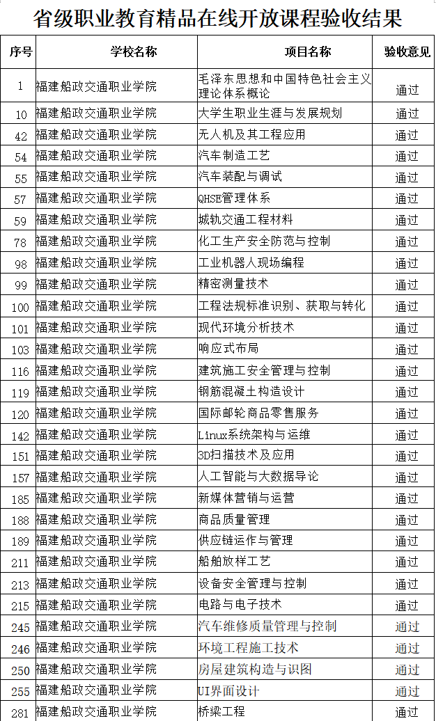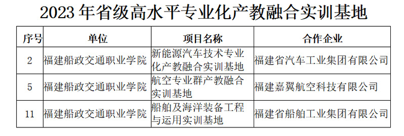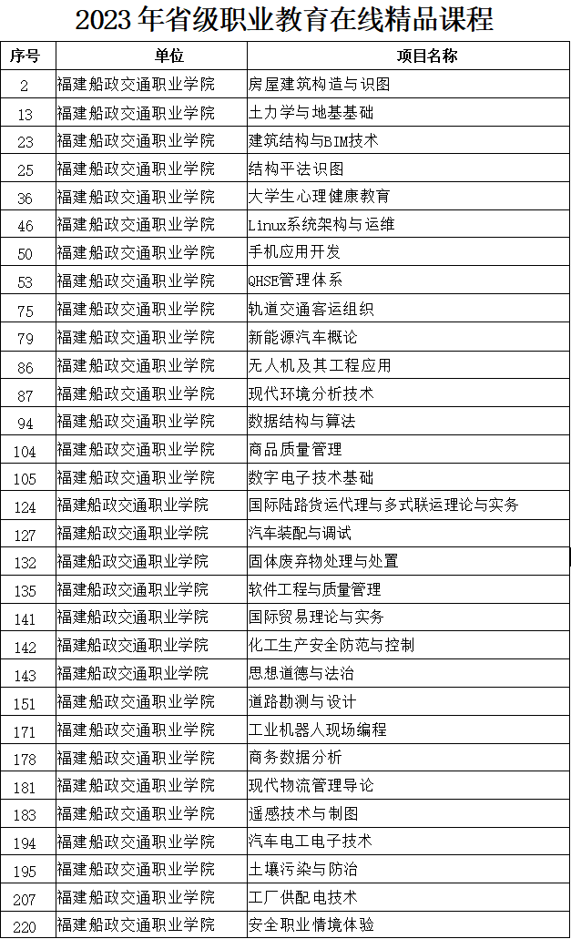 福建船舶職業(yè)教育集團(tuán)獲批省級示范性職業(yè)教育集團(tuán)(聯(lián)盟);工業(yè)人工智能產(chǎn)業(yè)學(xué)院獲批第五批省級高職院校產(chǎn)業(yè)學(xué)院試點(diǎn)項(xiàng)目;新能源汽車技術(shù)專業(yè)化產(chǎn)教融合實(shí)訓(xùn)基地、航空專業(yè)群產(chǎn)教融合實(shí)訓(xùn)基地、船舶及海洋裝備工程與運(yùn)用實(shí)訓(xùn)基地等3個實(shí)訓(xùn)基地獲批省級高水平專業(yè)化產(chǎn)教融合實(shí)訓(xùn)基地;智能供應(yīng)鏈、環(huán)境工程技術(shù)、海洋裝備制造與運(yùn)用技術(shù)等3個虛擬仿真實(shí)訓(xùn)基地獲批省級職業(yè)教育示范性虛擬仿真實(shí)訓(xùn)基地;《房屋建筑構(gòu)造與識圖》《土力學(xué)與地基基礎(chǔ)》《建筑結(jié)構(gòu)與BIM技術(shù)》等64門課程入選省級職業(yè)教育在線精品課程;船舶工程技術(shù)、城市軌道交通工程技術(shù)、虛擬現(xiàn)實(shí)技術(shù)應(yīng)用等6個資源庫獲批省級專業(yè)教學(xué)資源庫;《毛澤東思想和中國特色社會主義理論體系概論》《大學(xué)生職業(yè)生涯與發(fā)展規(guī)劃》《無人機(jī)及其工程應(yīng)用》等43門課程通過省級職業(yè)教育精品在線開放課程驗(yàn)收;環(huán)境工程技術(shù)、新能源汽車技術(shù)、統(tǒng)計與會計核算等3個資源庫通過省級職業(yè)教育專業(yè)教學(xué)資源庫驗(yàn)收。