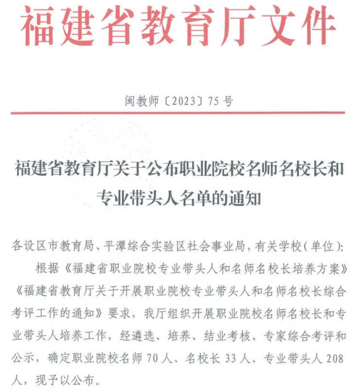 近日,《福建省教育廳關(guān)于公布職業(yè)院校名師名校長和專業(yè)帶頭人名單的通知》(閩教師〔2023〕75號(hào))印發(fā),經(jīng)省教育廳遴選、培養(yǎng)、結(jié)業(yè)考核、專家綜合考評和公示,我院房曰榮、陳秀華被確定為福建省高職院校名師,高汝武被確定為福建省高職院校名校長,陳明仙、翁國玲、陳天炎、黃金鳳、蘇慶列、李翼被確定為福建省高職院校專業(yè)帶頭人。