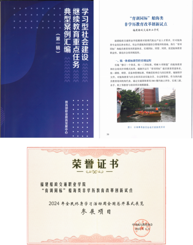 近日,教育部發(fā)布了《2023年學習型社會建設(高等繼續(xù)教育領域)重點任務名單》,全國共有100項學歷繼續(xù)教育教學改革創(chuàng)新任務、100項非學歷教育改革創(chuàng)新任務、50項探索三教統(tǒng)籌協(xié)同創(chuàng)新路徑任務入圍培育建設名單。由我院航海學院申報的《“育訓同標”船海類非學歷教育改革創(chuàng)新試點》成功入選非學歷教育教學改革創(chuàng)新項目,并作為典型案例在2024年全民終身學習活動周全國總開幕式上展出。