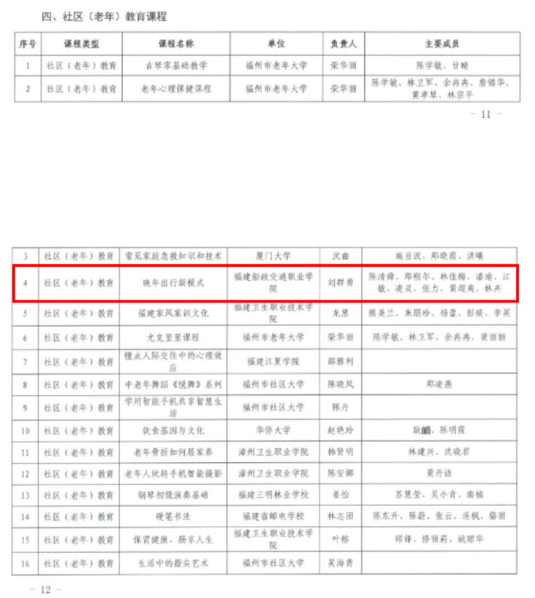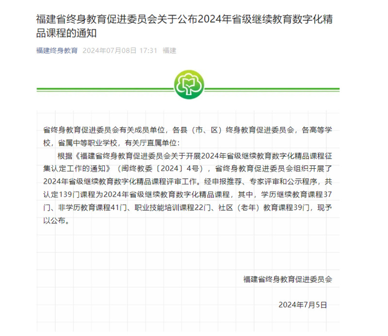 近日,福建省終身教育促進委員會公布《2024年省級繼續(xù)教育數(shù)字化精品課程》,共認定139門課程為2024年省級繼續(xù)教育數(shù)字化精品課程,其中,學(xué)歷繼續(xù)教育課程37門、非學(xué)歷教育課程41門、職業(yè)技能培訓(xùn)課程22門、社區(qū)(老年)教育課程39門。我院非學(xué)歷教育課程《安全急救與護理》《新能源汽車高壓系統(tǒng)與安全》《供水管道工培訓(xùn)》、社區(qū)(老年)教育課程《晚年出行新模式》共四門課程成功入選。