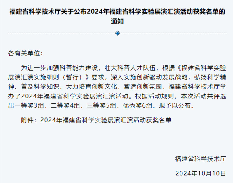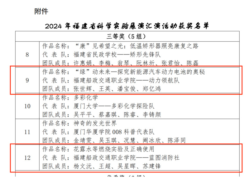 近日,由福建省科學(xué)技術(shù)廳主辦的2024年福建省科學(xué)實(shí)驗(yàn)展演匯演大賽在福州舉行,我院科技處選送的汽車學(xué)院作品“‘綠’動(dòng)未來—探究新能源汽車動(dòng)力電池的奧秘”科普實(shí)驗(yàn)項(xiàng)目、安全與環(huán)境學(xué)院作品“花露水等燃燒實(shí)驗(yàn)及正確使用”科普實(shí)驗(yàn)項(xiàng)目榮獲三等獎(jiǎng)。