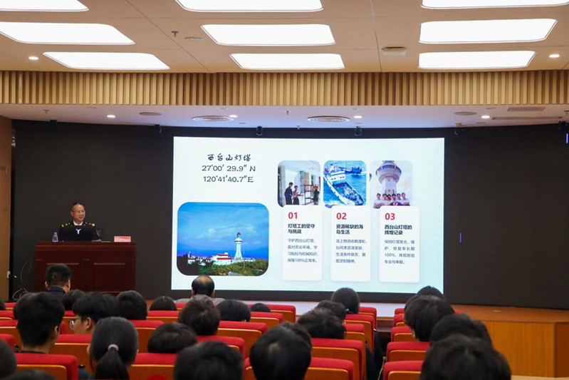 互動(dòng)環(huán)節(jié)結(jié)束后,福州航標(biāo)處馮振剛老師從航海專業(yè)的角度用形象生動(dòng)的案例向在場觀眾詳細(xì)介紹了航標(biāo)處的運(yùn)作情況。他指出要把在課堂上學(xué)到的理論與實(shí)際相結(jié)合,要大力弘揚(yáng)勞模精神、勞動(dòng)精神、工匠精神,不斷提升自身技術(shù)技能水平,以適應(yīng)科技革命和產(chǎn)業(yè)變革的需要,為實(shí)現(xiàn)中華民族偉大復(fù)興的中國夢貢獻(xiàn)自己的青春力量。