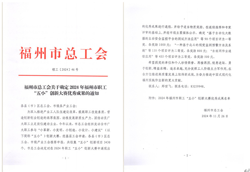 近日,福州市總工會公布《關(guān)于確定2024年福州市職工 “五小”創(chuàng)新大賽優(yōu)秀成果的通知》,我院鄒澤昌勞模和工匠人才創(chuàng)新工作室報送的創(chuàng)新成果榮獲一等獎2項、二等獎1項、三等獎2項。