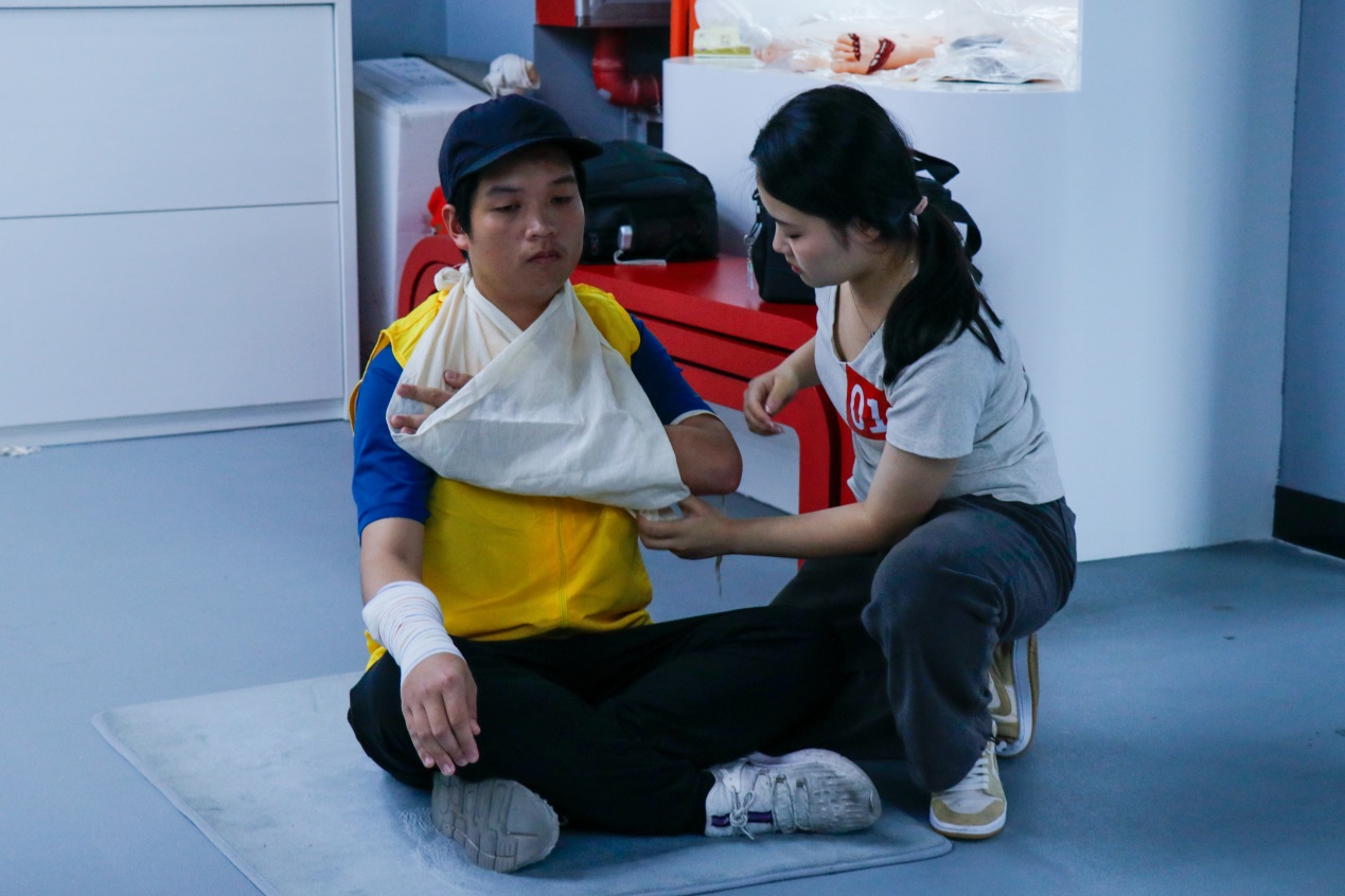 決賽的第二階段是對傷員進行左前臂出血傷情處置。6名志愿者模擬傷員,參賽選手們在5分鐘之內完成左前臂出血的止血、包扎和傷肢承托操作,并全程做好傷員的人文關懷。