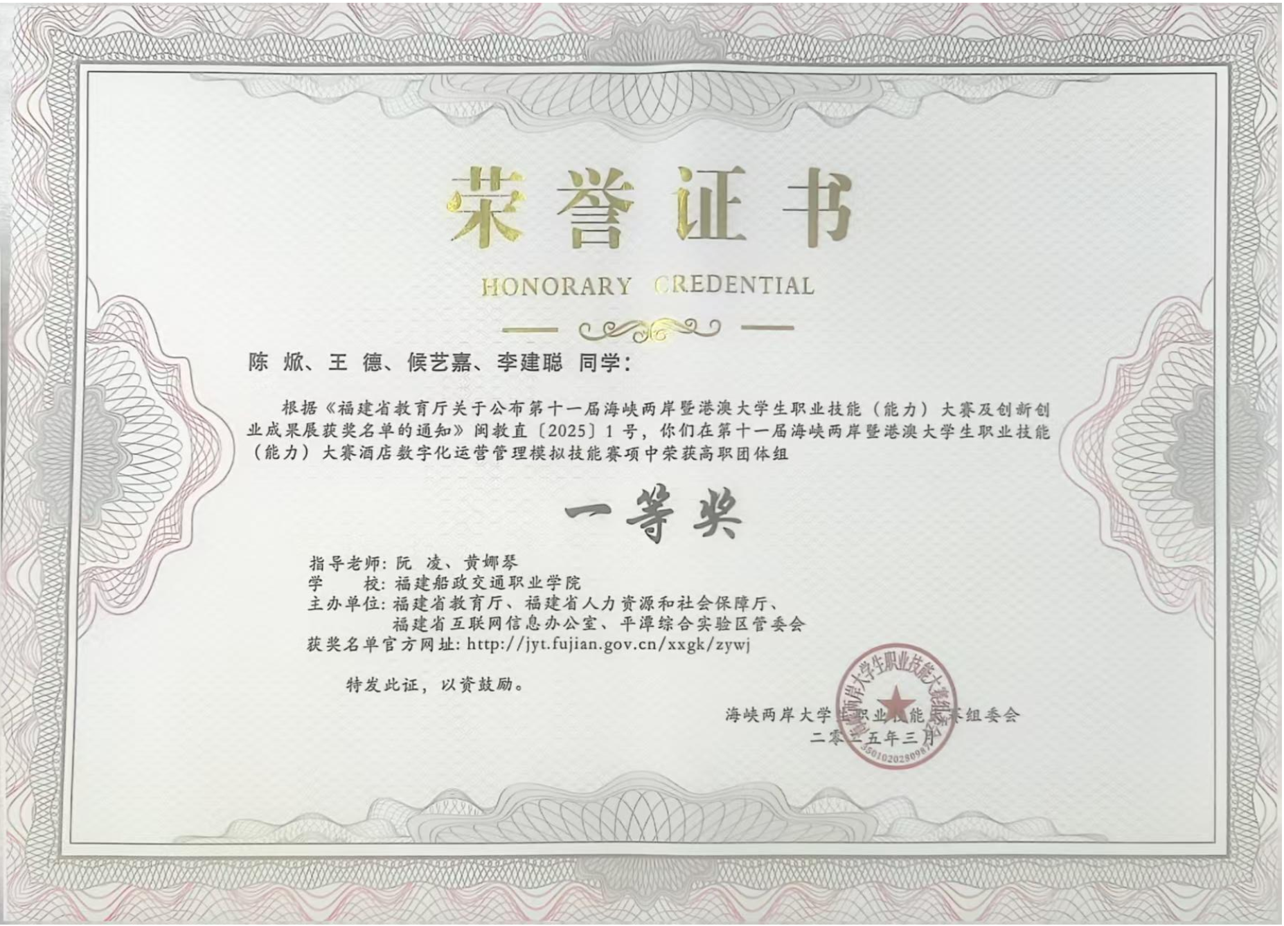 第十一屆海峽兩岸暨港澳大學生技能大賽中,榮獲酒店數字化運營管理模擬賽項一等獎,展現了卓越的數字化管理能力;
