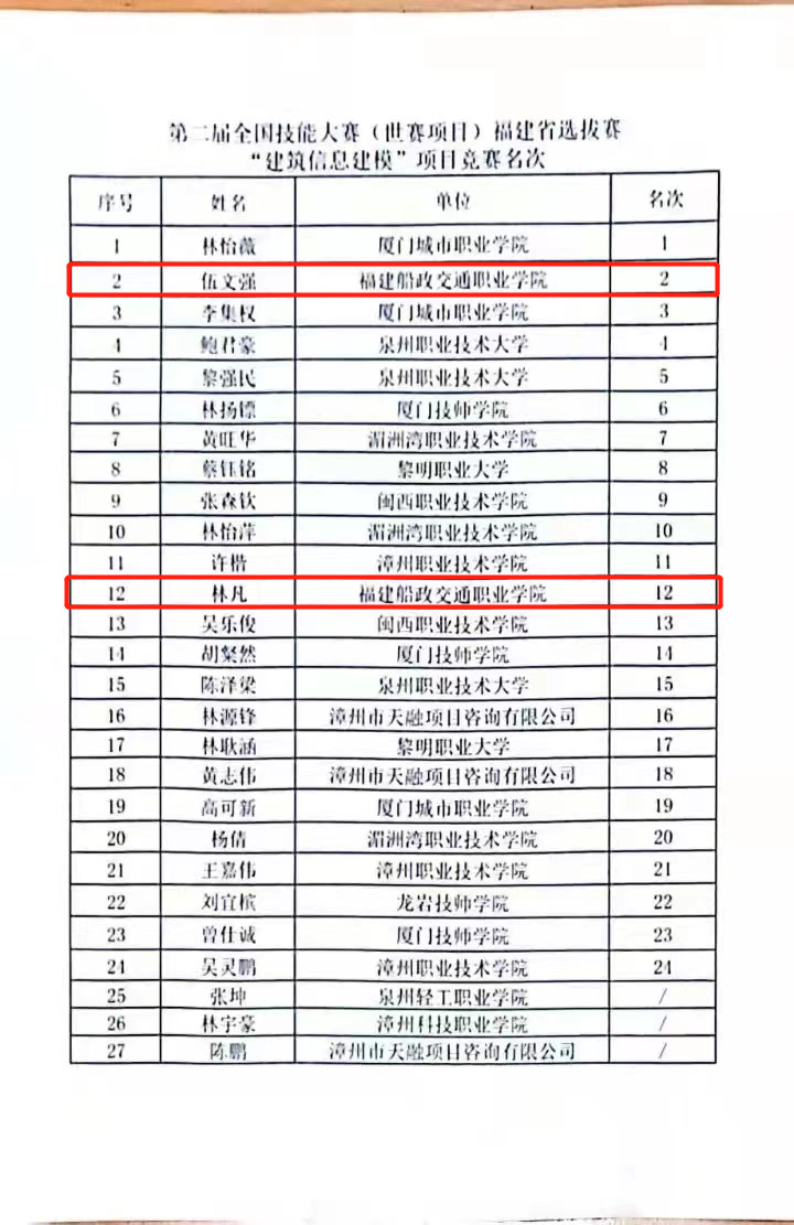 2023年3月7-9日,第二屆全國技能大賽(世賽項目)福建省選拔賽“建筑信息建模”賽項決賽在漳州職業(yè)技術(shù)學(xué)院舉行。福建省13個單位27名選手參賽。我院2名選手參賽,其中選手20級建筑工程技術(shù)3班伍文強同學(xué)在王喆、高巧玲、劉曉紅等BIM教師團隊指導(dǎo)下取得了第2名的成績,斬獲一枚銀牌,實現(xiàn)該項賽事獎牌零的突破。伍文強同學(xué)榮獲“福建省技能能手”稱號和建筑信息模型技術(shù)員“技師”資格,并有機會晉級國賽。另一名選手20級建筑工程技術(shù)1班林凡同學(xué)榮獲本項賽事的第12名。