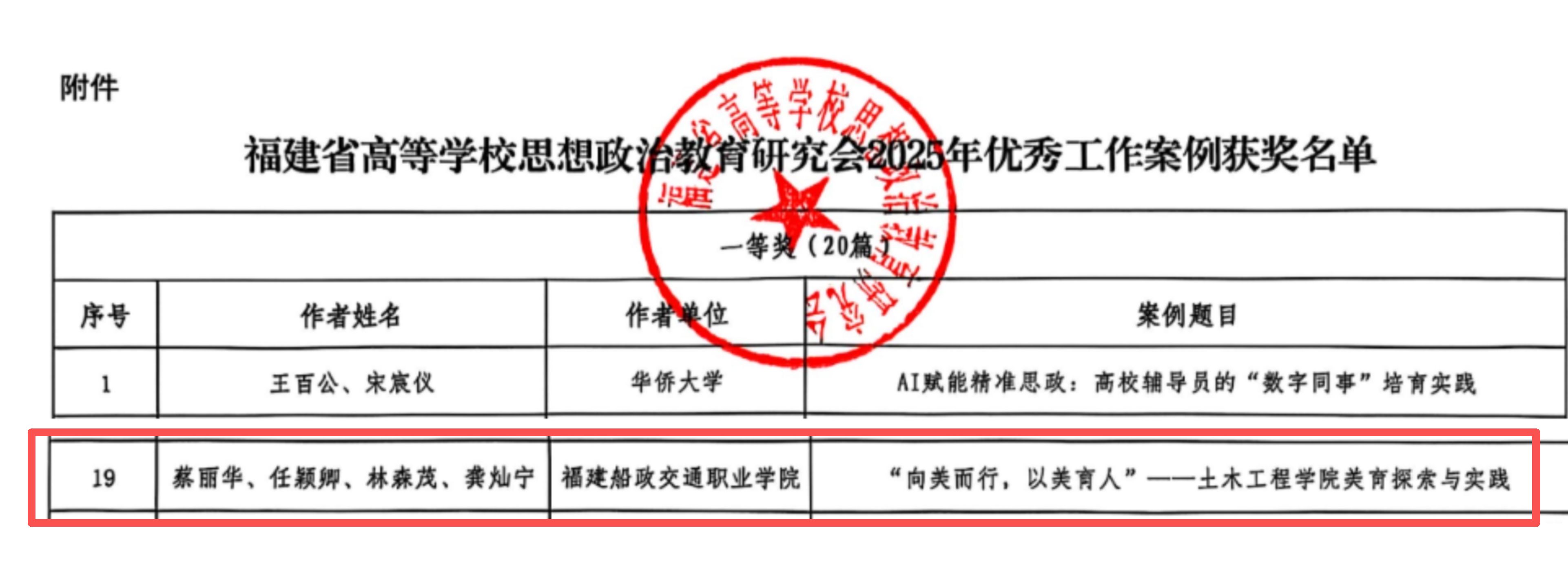 近日,福建省高等學(xué)校思想政治教育研究會(huì)公布了關(guān)于表彰2025年優(yōu)秀工作案例的通知。土木工程學(xué)院網(wǎng)絡(luò)育人工作案例《“向美而行,以美育人”——土木工程學(xué)院美育探索與實(shí)踐》獲評(píng)一等獎(jiǎng)。