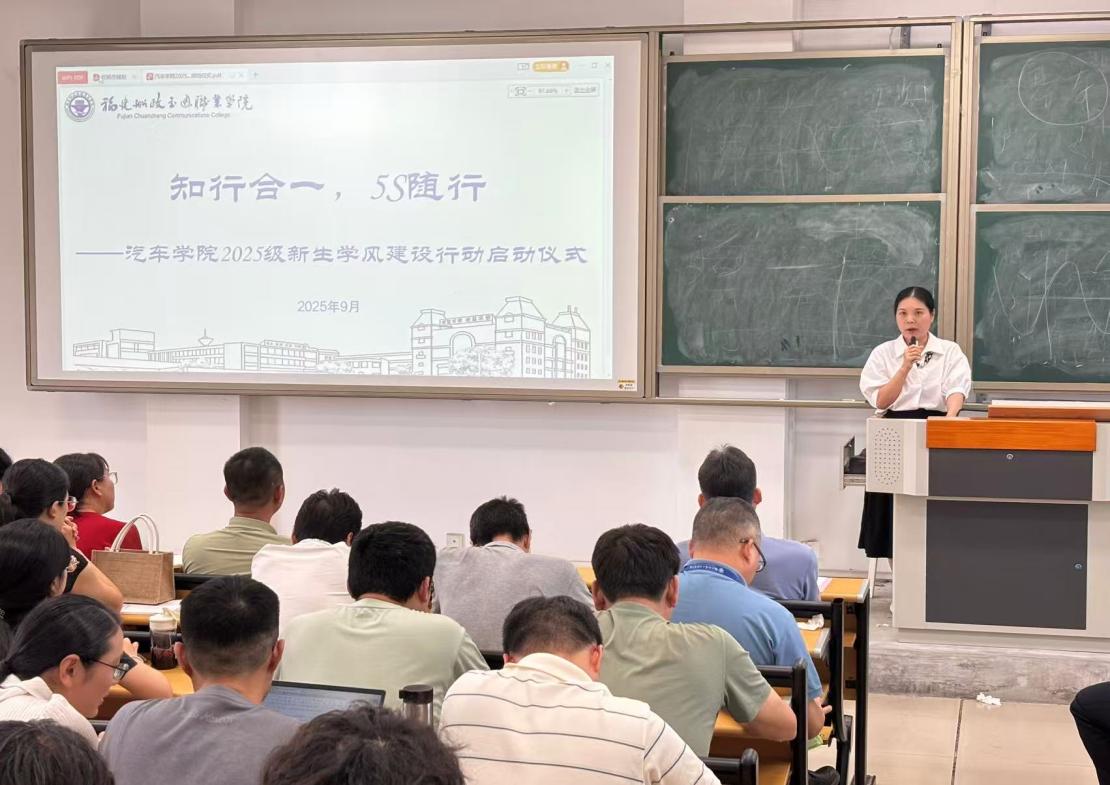 為深入學(xué)習(xí)貫徹黨的二十大精神和習(xí)近平總書記關(guān)于教育工作的重要指示精神,進(jìn)一步加強(qiáng)汽車學(xué)院學(xué)風(fēng)建設(shè),提升人才培養(yǎng)質(zhì)量,汽車學(xué)院于9月24日在北區(qū)26號(hào)樓605教室開展以“知行合一、5S隨行”為主題的2025級(jí)新生學(xué)風(fēng)建設(shè)啟動(dòng)儀式。學(xué)院黨政領(lǐng)導(dǎo)、全體教師、輔導(dǎo)員及2024級(jí)學(xué)生干部、2025級(jí)學(xué)生代表100多人參加此次活動(dòng)。儀式由學(xué)院副院長(zhǎng)林可春主持。