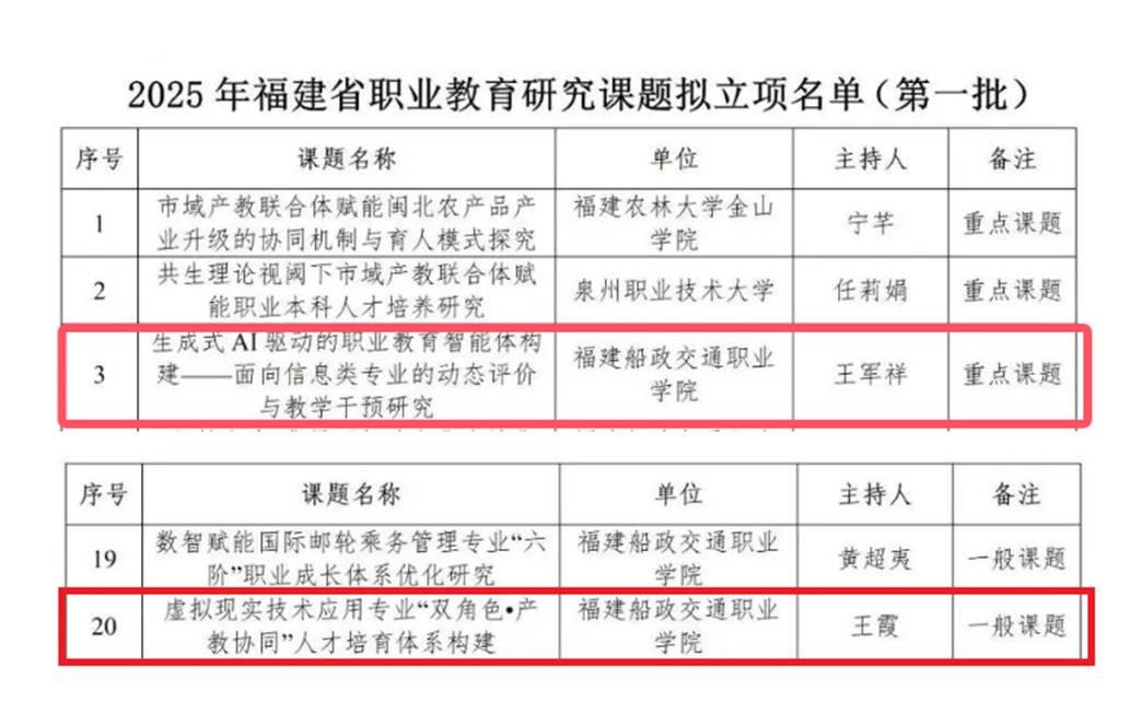 根據(jù)《關于開展2025年福建省職業(yè)教育研究課題立項申報工作的通知》(閩職教中〔2025〕8號),經福建省職業(yè)技術教育中心組織專家評審、會議研究,王軍祥老師申報的《生成式AI驅動的職業(yè)教育智能體構建-面向信息類專業(yè)的動態(tài)評價與教學干預研究》獲批重點課題立項;我院王霞老師申報的《虛擬現(xiàn)實技術應用專業(yè)“雙角色?產教協(xié)同”人才培育體系構建》獲批一般課題立項。