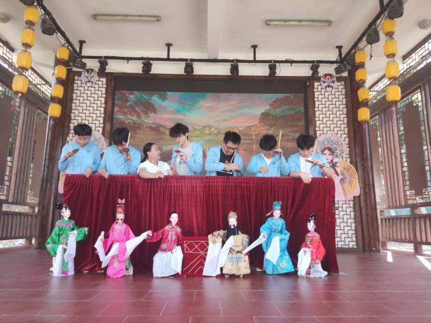 暮色之中,傳承團前往木偶戲戲臺學習提線木偶。在觀看了一場精彩的《拜壽》戲曲后,成員們躍躍欲試,開始對提線木偶技藝進行初步嘗試。細繩纏繞指尖,輕拉慢放間,木偶仿佛被注入了生命,輕輕顫動。成員們?nèi)褙炞?,一絲不茍地模仿師傅的動作,盡管手法尚顯生疏,卻難掩對這門古老藝術(shù)的敬畏與熱愛。在這靜謐與靈動交織的瞬間,傳統(tǒng)技藝的種子悄然播撒心田,激發(fā)起成員們傳承與創(chuàng)新的責任感。