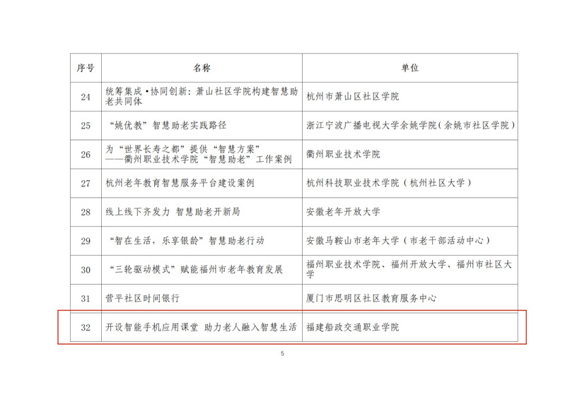 9月15日,教育部職業(yè)教育與成人教育司公布了第二批“智慧助老”優(yōu)質(zhì)工作案例(59個(gè))、優(yōu)質(zhì)教育培訓(xùn)項(xiàng)目(70個(gè))和優(yōu)質(zhì)課程資源(169門),我院《開設(shè)智能手機(jī)應(yīng)用課堂 助力老人融入智慧生活》項(xiàng)目入選為“智慧助老”優(yōu)質(zhì)工作案例,將在全國(guó)老年教育資源共享和公共服務(wù)平臺(tái)展示推介。