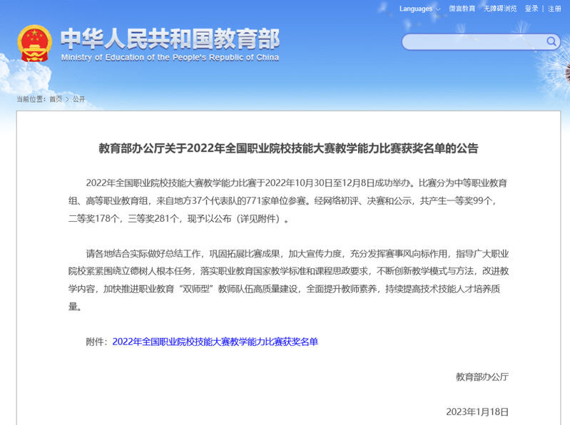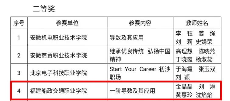 1月18日,教育部辦公廳公布由教育部主辦,代表全國職業(yè)院校教學能力最高水平的權(quán)威賽事--2022年全國職業(yè)院校技能大賽教學能力比賽獲獎名單。我校通識教育學院金晶晶、劉淋、黃惠玲、沈焰焰教學團隊的作品《一階導數(shù)及其應用》榮獲二等獎。
