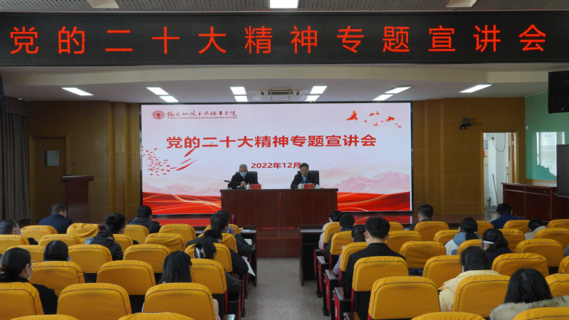 12月23日,為深入學(xué)習(xí)宣傳貫徹黨的二十大精神,我校黨委書記張海明、校長(zhǎng)陳錦輝以《思想偉力領(lǐng)航向,擘畫復(fù)興新藍(lán)圖》為主題,向師生宣講黨的二十大精神。2022年新提任干部、所在黨支部成員、分管部門成員以及學(xué)生代表參加宣講會(huì)。