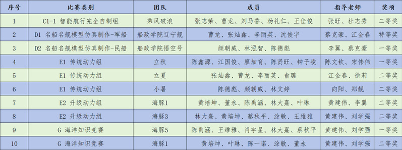 在全國海洋航行器大賽賽場上,吸引著來自北京大學、上海交通大學、浙江大學、哈爾濱工業(yè)大學等371所院校和科研院所的2785支參賽隊伍,覆蓋學生超萬人。大賽圍繞創(chuàng)新創(chuàng)意創(chuàng)業(yè)、設計與制作、智慧船舶與海洋工程技術(shù)、名船名艦模型仿真制作、船模競速、帆船模型競速、海洋知識競賽七大類比賽項目展開角逐。我校參賽學生在此次賽事中再創(chuàng)佳績,共獲得特等獎 1 項、一等獎 3 項、二等獎 6 項。