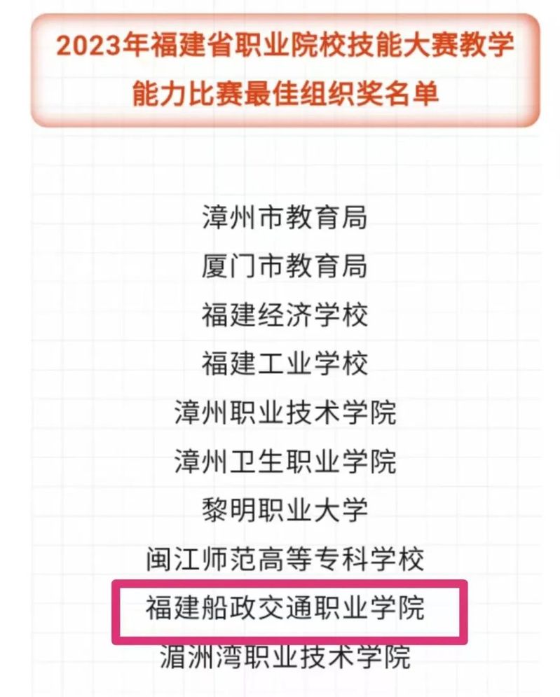 近期,省教育廳公布2023年福建省職業(yè)院校技能大賽教學(xué)能力比賽獲獎(jiǎng)名單。我校成績(jī)優(yōu)異,共獲獎(jiǎng)11項(xiàng),其中一等獎(jiǎng)4項(xiàng),二等獎(jiǎng)3項(xiàng),三等獎(jiǎng)4項(xiàng),成績(jī)位列福建省前列,并榮獲最佳組織獎(jiǎng)。