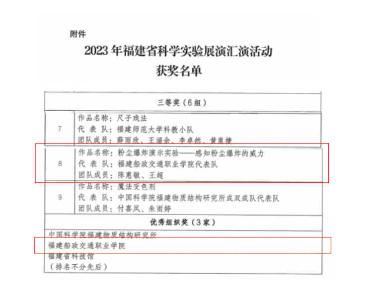近日,由福建省科學(xué)技術(shù)廳主辦的首屆“福建省科學(xué)實(shí)驗(yàn)展演匯演大賽”決賽在福州舉行,我院科技處選送的安全與環(huán)境學(xué)院作品“面粉塵爆炸”科普實(shí)驗(yàn)項(xiàng)目榮獲三等獎(jiǎng),學(xué)院榮獲優(yōu)秀組織獎(jiǎng)。