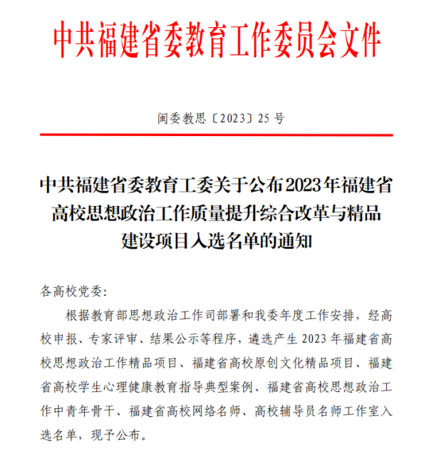 近日,中共福建省委教育工委公布了2023年福建省高校思想政治工作質(zhì)量提升綜合改革與精品建設(shè)項(xiàng)目入選名單,我院“‘四維度·五聯(lián)動(dòng)·六開(kāi)心’育人育心體系探索與實(shí)踐”、原創(chuàng)話劇《赤海》2個(gè)項(xiàng)目名列其中。