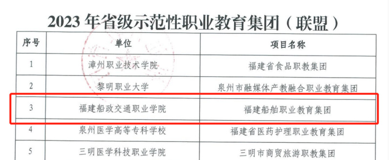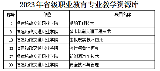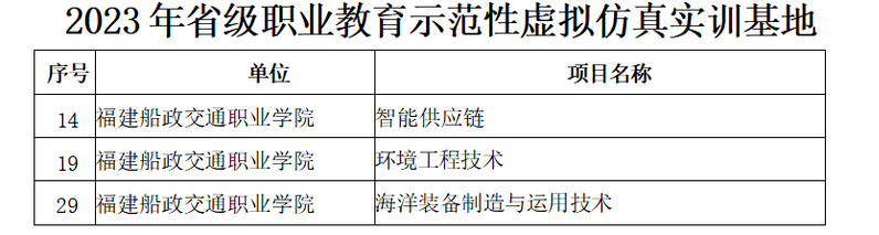 福建船舶職業(yè)教育集團(tuán)獲批省級示范性職業(yè)教育集團(tuán)(聯(lián)盟);工業(yè)人工智能產(chǎn)業(yè)學(xué)院獲批第五批省級高職院校產(chǎn)業(yè)學(xué)院試點(diǎn)項(xiàng)目;新能源汽車技術(shù)專業(yè)化產(chǎn)教融合實(shí)訓(xùn)基地、航空專業(yè)群產(chǎn)教融合實(shí)訓(xùn)基地、船舶及海洋裝備工程與運(yùn)用實(shí)訓(xùn)基地等3個實(shí)訓(xùn)基地獲批省級高水平專業(yè)化產(chǎn)教融合實(shí)訓(xùn)基地;智能供應(yīng)鏈、環(huán)境工程技術(shù)、海洋裝備制造與運(yùn)用技術(shù)等3個虛擬仿真實(shí)訓(xùn)基地獲批省級職業(yè)教育示范性虛擬仿真實(shí)訓(xùn)基地;《房屋建筑構(gòu)造與識圖》《土力學(xué)與地基基礎(chǔ)》《建筑結(jié)構(gòu)與BIM技術(shù)》等64門課程入選省級職業(yè)教育在線精品課程;船舶工程技術(shù)、城市軌道交通工程技術(shù)、虛擬現(xiàn)實(shí)技術(shù)應(yīng)用等6個資源庫獲批省級專業(yè)教學(xué)資源庫;《毛澤東思想和中國特色社會主義理論體系概論》《大學(xué)生職業(yè)生涯與發(fā)展規(guī)劃》《無人機(jī)及其工程應(yīng)用》等43門課程通過省級職業(yè)教育精品在線開放課程驗(yàn)收;環(huán)境工程技術(shù)、新能源汽車技術(shù)、統(tǒng)計與會計核算等3個資源庫通過省級職業(yè)教育專業(yè)教學(xué)資源庫驗(yàn)收。