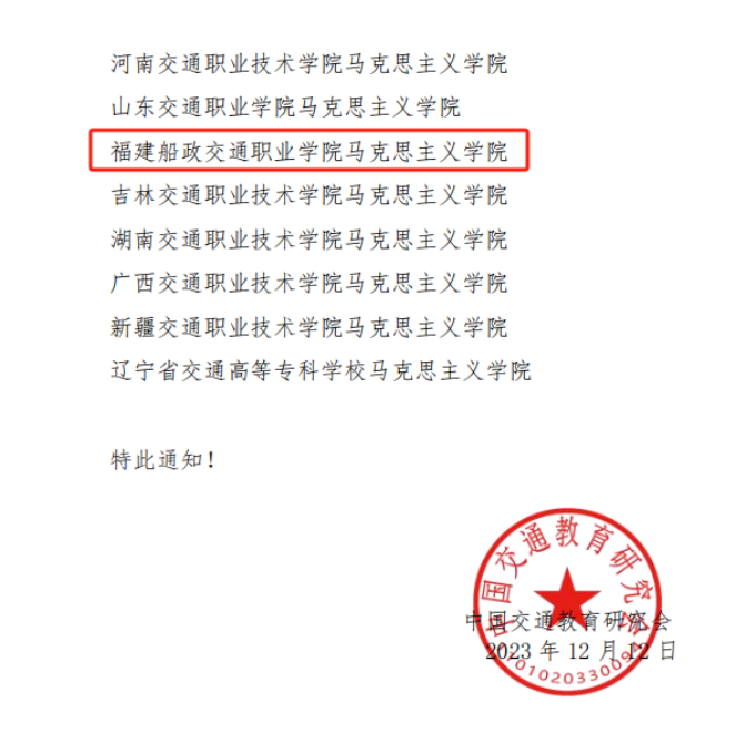 近日,我院馬克思主義學(xué)院被評(píng)為2023年全國(guó)交通職業(yè)院校示范馬克思主義學(xué)院。