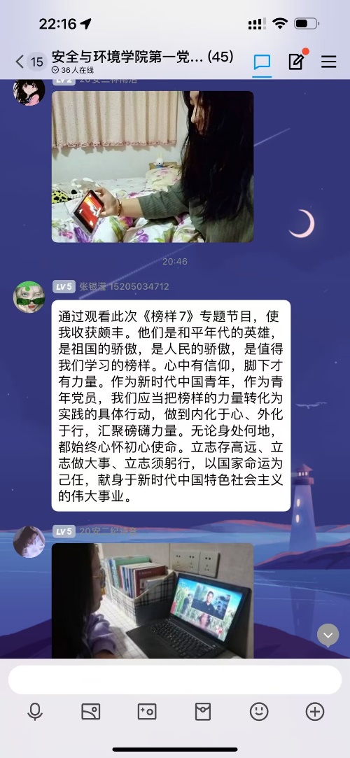 安全與環(huán)境學(xué)院第一黨支部主要以輔導(dǎo)員教師和學(xué)生為主,該支部組織教師黨員、學(xué)生黨員和入黨積極分子在創(chuàng)新樓201、202教室集中觀看,引發(fā)熱烈反響。觀看結(jié)束后,師生黨員通過(guò)線上、線下形式熱議,紛紛表達(dá)自己觀看《榜樣7》后的感想和觸動(dòng)。