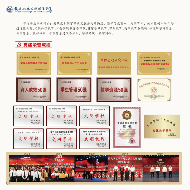十九大以來,福建船政交通職業(yè)學院堅持以習近平新時代中國特色社會主義思想為指導,堅持社會主義辦學方向,深入貫徹黨的十九大和十九屆歷次全會精神,堅守“為黨育人、為國育才”的初心和使命,慎終如始推進學校黨的政治建設、思想建設、組織建設、作風建設、紀律建設、制度建設,黨的組織體系和學校治理體系相得益彰,黨建引領推動創(chuàng)新船政、質(zhì)量船政、文化船政協(xié)奏齊鳴,政治生態(tài)、學術生態(tài)、文化生態(tài)持續(xù)向好,辦學效率、辦學效能、辦學效益顯著提升!