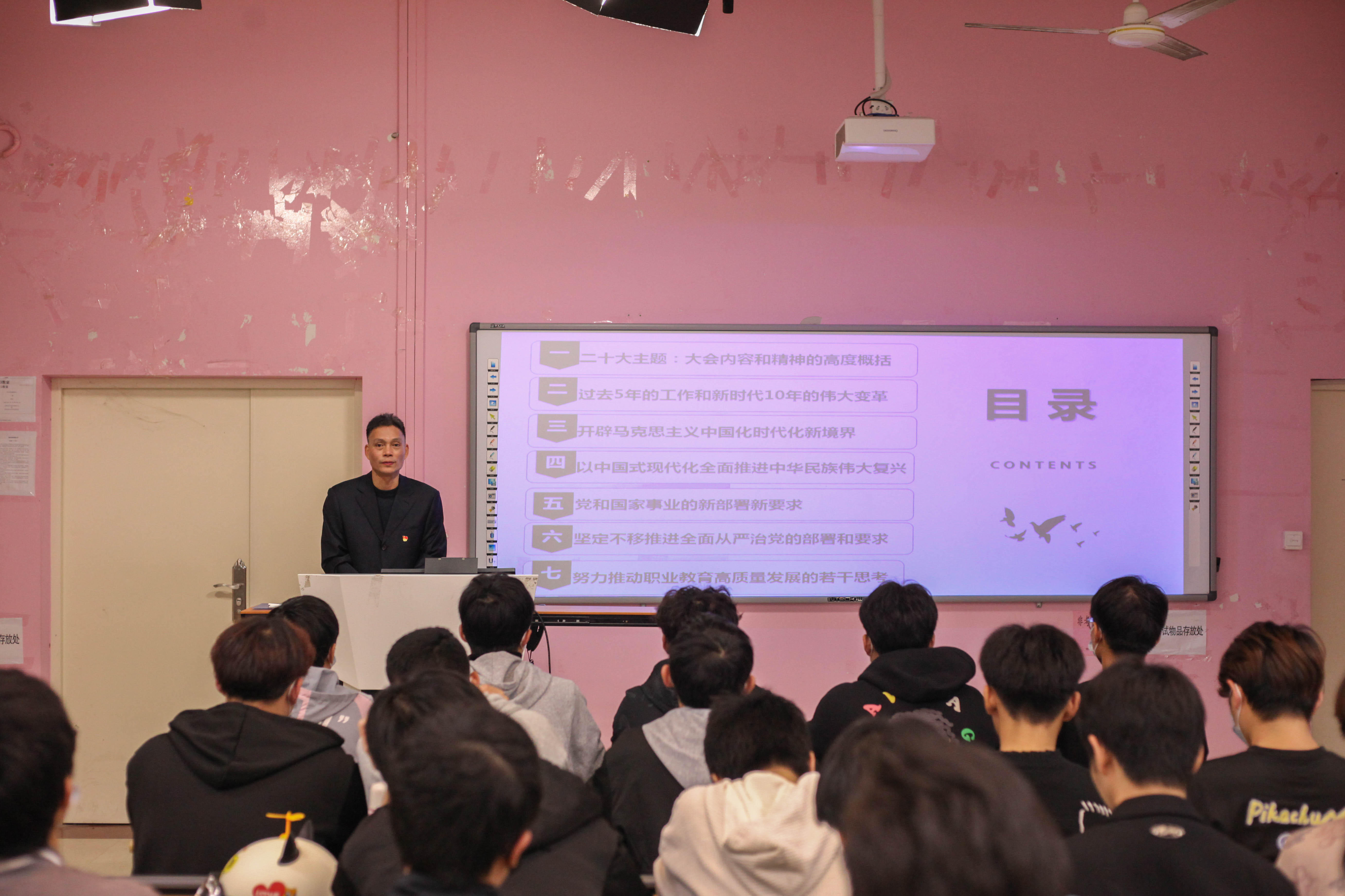 蔡華錦書記從“黨的二十大主題:大會內(nèi)容和精神的高度概括”、“過去5年的工作和新時代10年的偉大變革”、“開辟馬克思主義中國化時代化新境界”、“以中國式現(xiàn)代化全面推進中華民族偉大復(fù)興”、“黨和國家事業(yè)的新部署新要求”、“堅定不移推進全面從嚴治黨的部署和要求”、“努力推動職業(yè)教育高質(zhì)量發(fā)展的若干思考”七個方面展開宣講。引導(dǎo)青年學(xué)生們對中國式現(xiàn)代化知其然、知其所以然,弘揚偉大建黨精神,自信自強、守正創(chuàng)新,踔厲奮發(fā),勇毅前行,以更飽滿的精神面貌貢獻自己的青春力量。