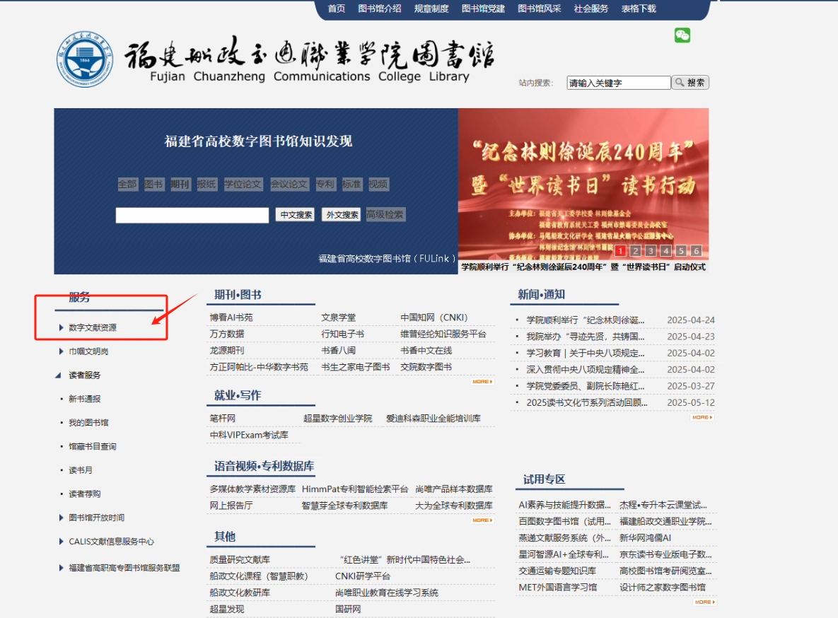 方法二:通過圖書館網(wǎng)站進(jìn)入數(shù)字文獻(xiàn)資源一站式訪問平臺。