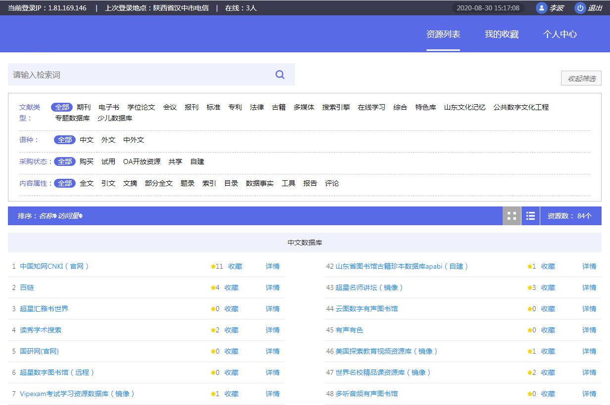 在登陸后的電子資源界面里我們能夠看到圖書館已對我們開放的電子資源,在點(diǎn)擊相應(yīng)的電子資源名稱后便能夠?yàn)g覽其中的內(nèi)容了、經(jīng)常使用的可以收藏起來,方便下次使用。