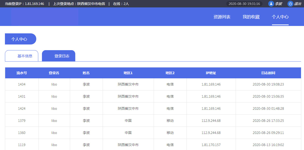 登錄日志中展示了當(dāng)前用戶的歷史登錄信息,包含登錄地點(diǎn)、登錄IP等信息,方便了解自己的賬號安全情況。