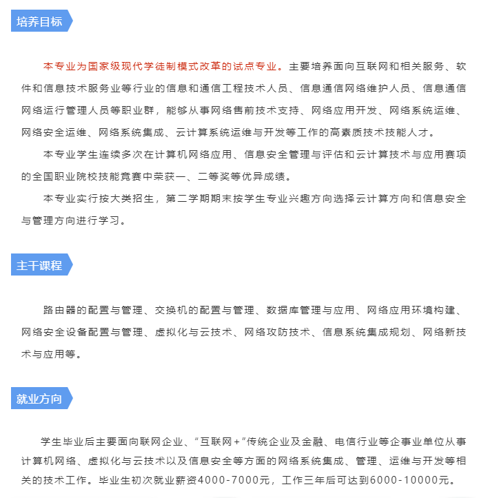 學(xué)院已與思科、星網(wǎng)銳捷、網(wǎng)龍等IT知名企業(yè)建立校企戰(zhàn)略合作,通過獲得國際職業(yè)技能證書,提高學(xué)生的學(xué)習(xí)興趣,提升其專業(yè)技能和就業(yè)競爭力。畢業(yè)生就業(yè)競爭力、就業(yè)率、薪資水平和就業(yè)穩(wěn)定度均居省內(nèi)院校前列。