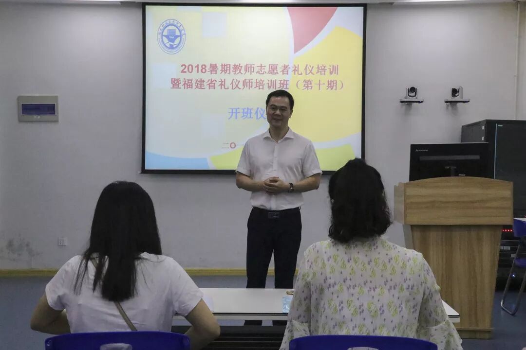 7月16日上午,培訓(xùn)班開班儀式在我校南區(qū)形體塑造中心舉行。福建禮儀協(xié)會(huì)會(huì)長蔡妮娜、福建禮儀協(xié)會(huì)秘書長黃利天、福建省禮儀協(xié)會(huì)常務(wù)理事紀(jì)智媛副教授、校團(tuán)委陳慧副書記及參加培訓(xùn)的教師志愿者出席了本次開班儀式。