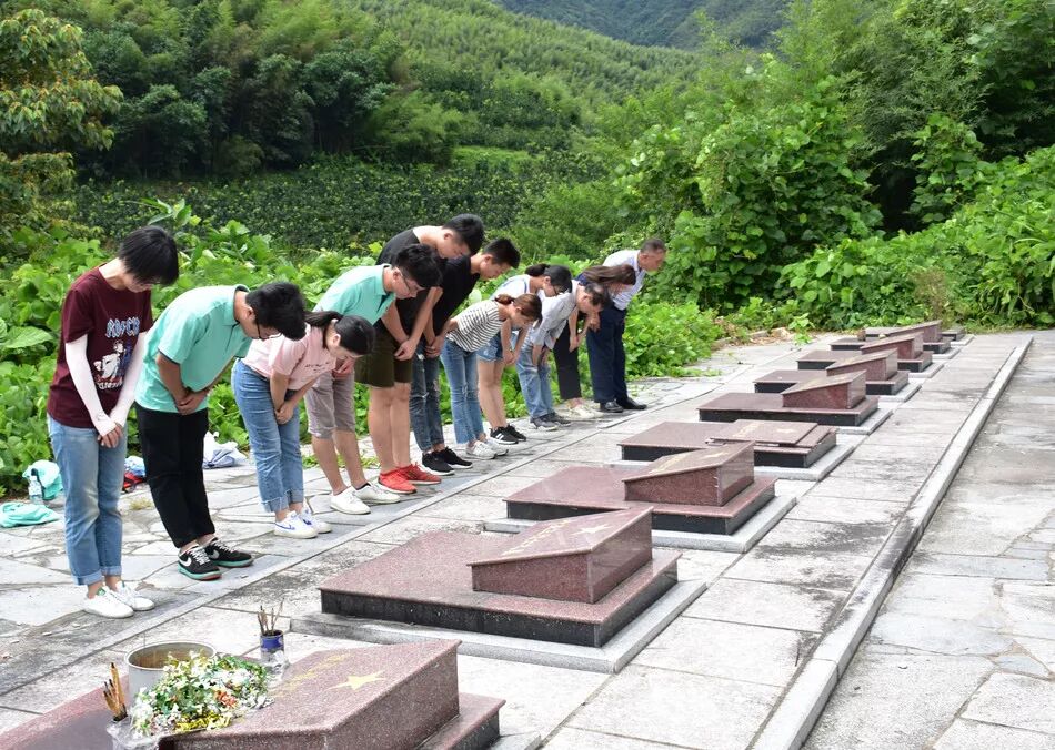 離開了紀念館,實踐隊來到了大嶺村烈士陵園。在當年那戰(zhàn)火紛飛的年代,為了中國人民的解放事業(yè),許多仁人志士在這里拋頭顱,灑熱血,奉獻出自己寶貴的生命,由于戰(zhàn)爭時期條件限制,在這里浴血奮戰(zhàn)的革命烈士們零散埋葬在南坑鎮(zhèn)各個地方,為緬懷先烈,特遷移至此。實踐隊隊員們站在烈士碑前,緬懷烈士們豐功偉績,三鞠躬表達自己對烈士的敬仰之情。